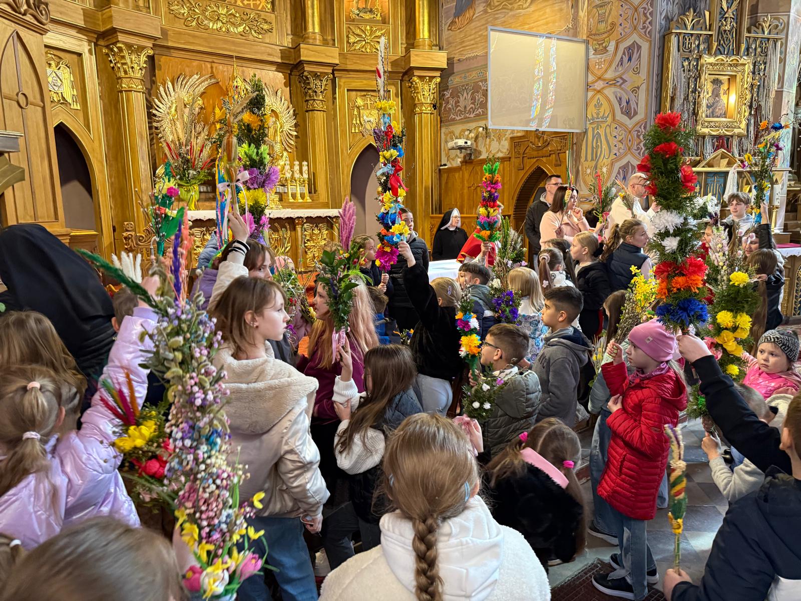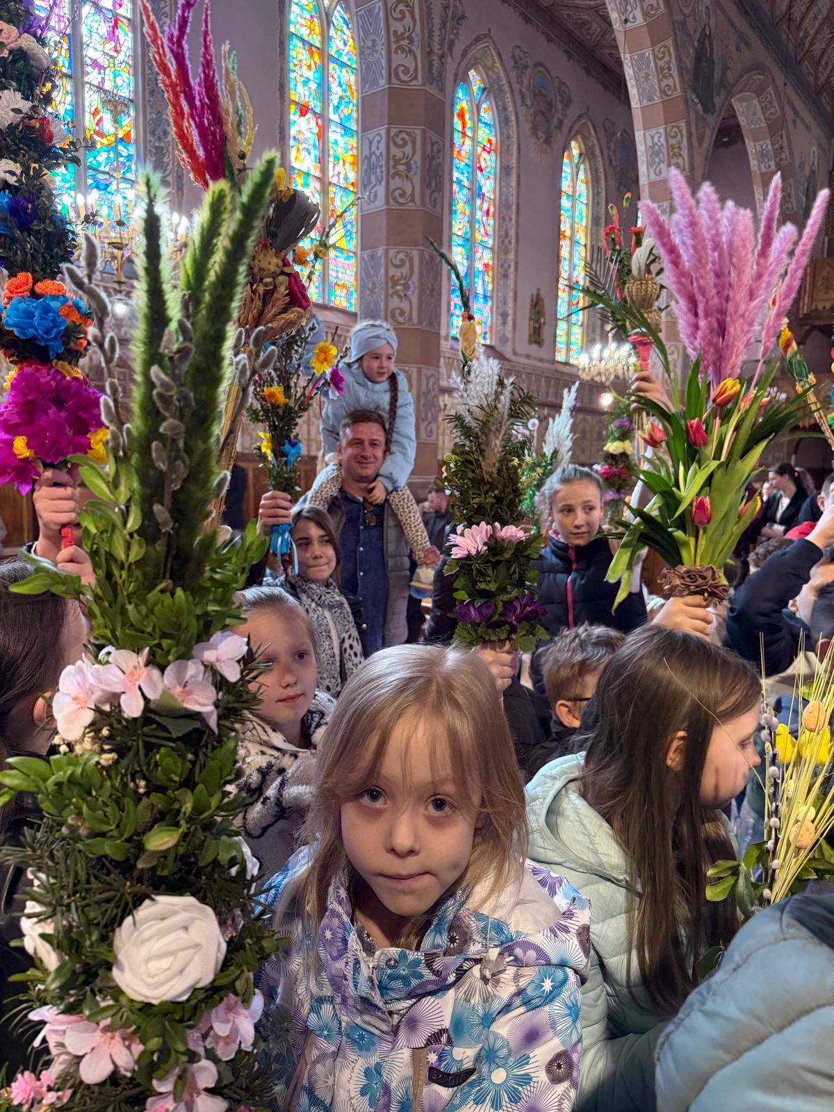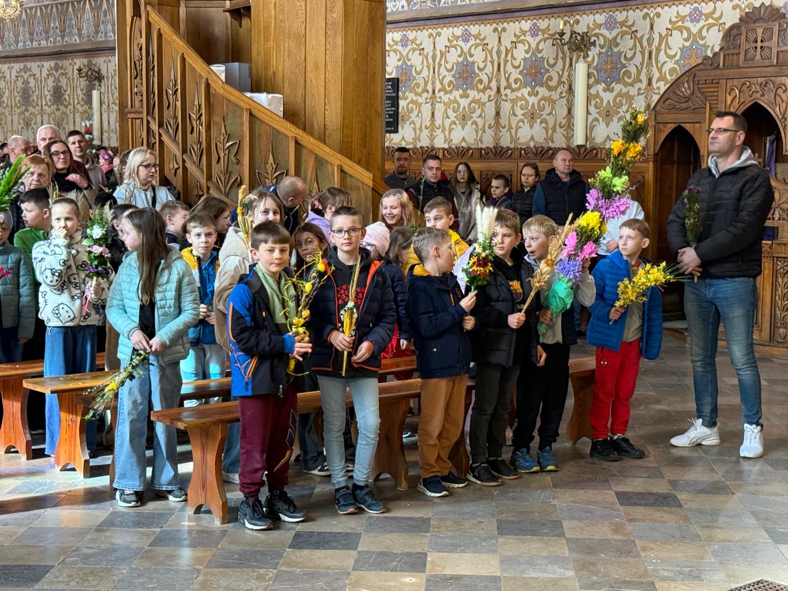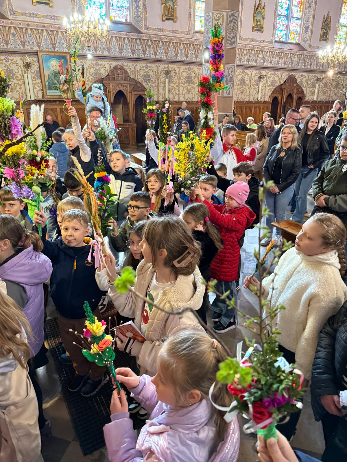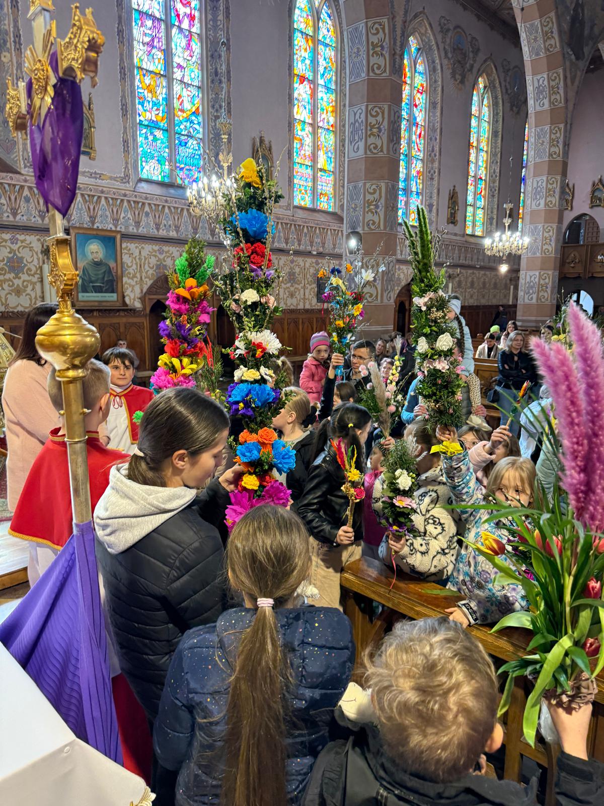 Wspomnienie uroczystego wjazdu Pana Jezusa do Jerozolimy znane jako niedziela palmowa co roku przeżywamy radośnie i kolorowo. Podczas Mszy Świętej o godzinie 11:30 odbyła się procesja wokół kościoła z palmami i wesołym śpiewem scholi dziecięcej prowadzonej przez p. Jolantę Wilczyńską. Cały kościół wypełniły własnoręcznie zrobione palmy i część wymagała nawet kilku tygodni pracy. Serdecznie gratulujemy! Zapraszamy do obejrzenia zdjęć z tego wydarzenia. Jednocześnie zachęcamy do uczestnictwa w Triduum Paschalnym w naszej Parafii.