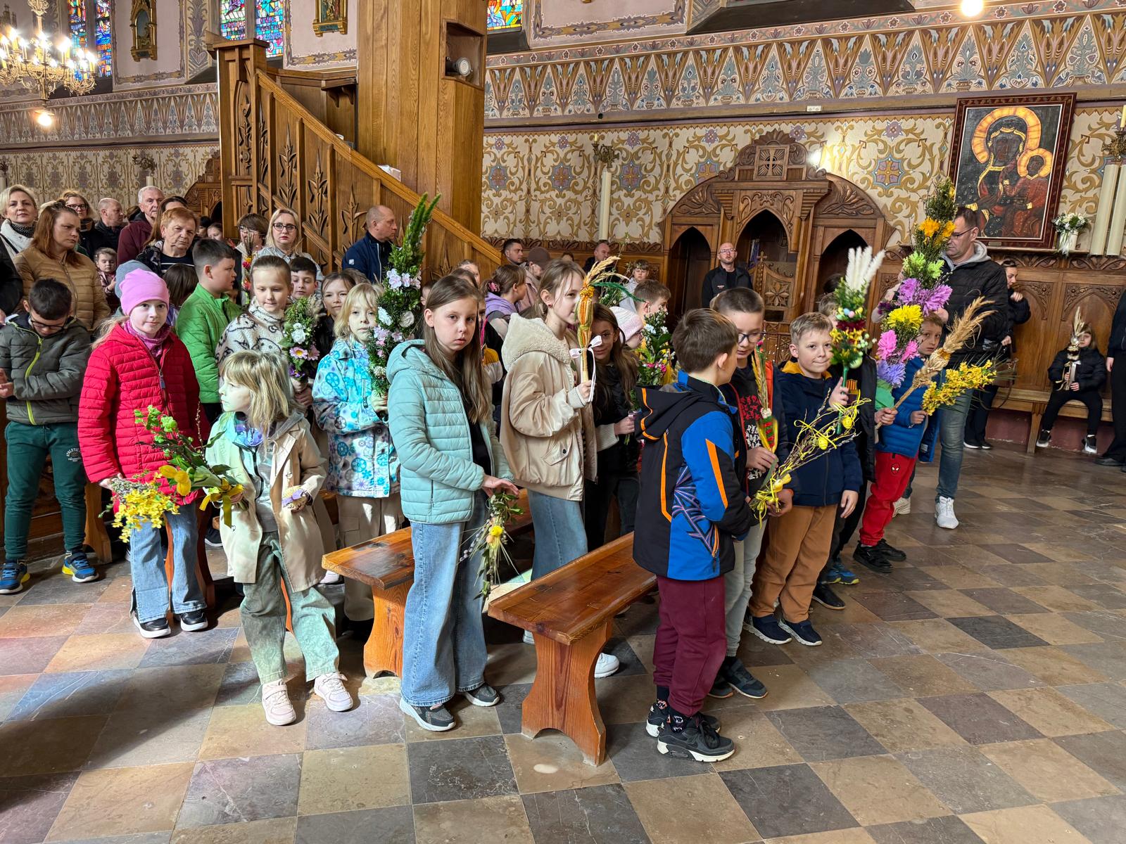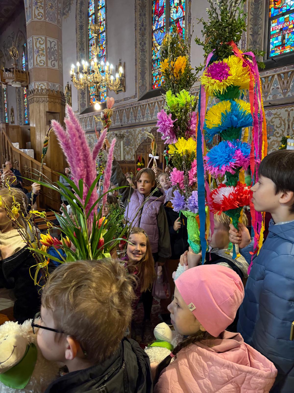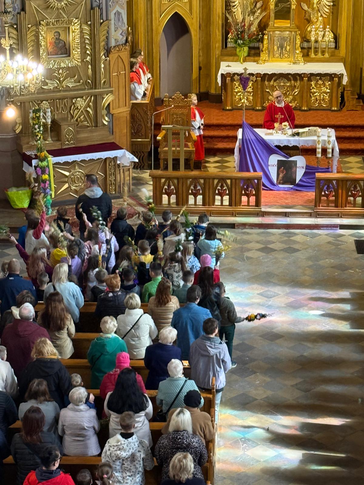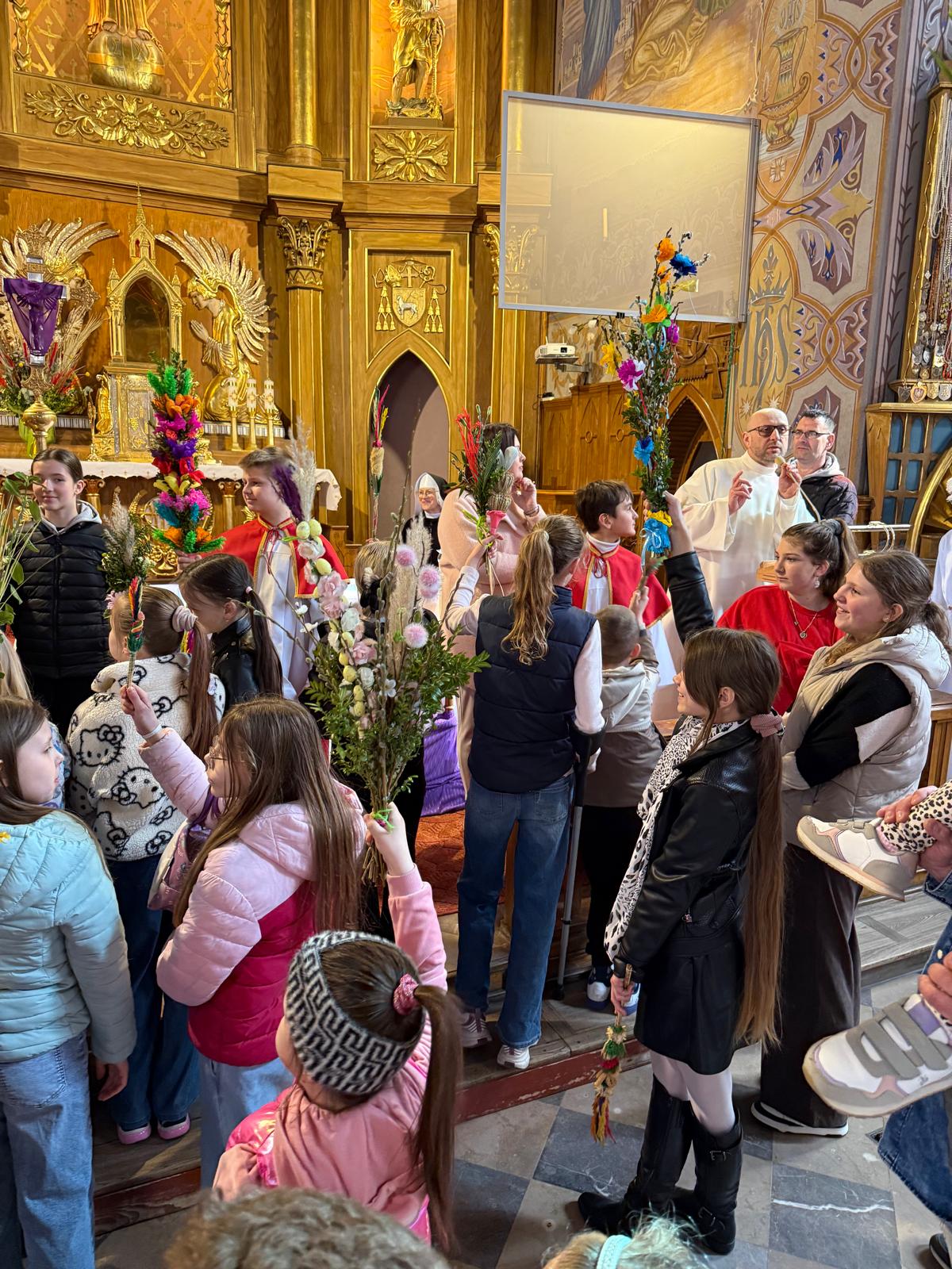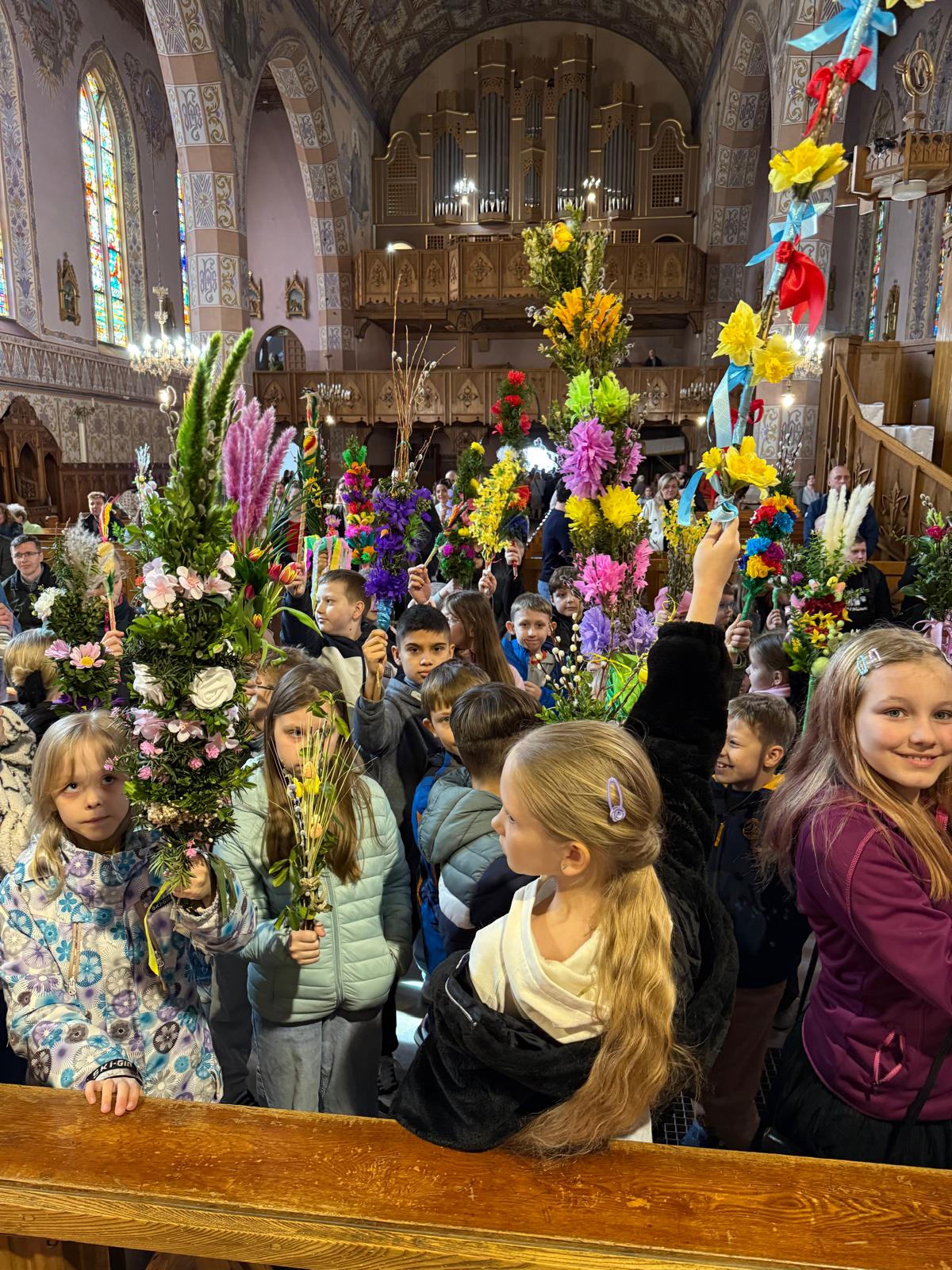 Wspomnienie uroczystego wjazdu Pana Jezusa do Jerozolimy znane jako niedziela palmowa co roku przeżywamy radośnie i kolorowo. Podczas Mszy Świętej o godzinie 11:30 odbyła się procesja wokół kościoła z palmami i wesołym śpiewem scholi dziecięcej prowadzonej przez p. Jolantę Wilczyńską. Cały kościół wypełniły własnoręcznie zrobione palmy i część wymagała nawet kilku tygodni pracy. Serdecznie gratulujemy! Zapraszamy do obejrzenia zdjęć z tego wydarzenia. Jednocześnie zachęcamy do uczestnictwa w Triduum Paschalnym w naszej Parafii.