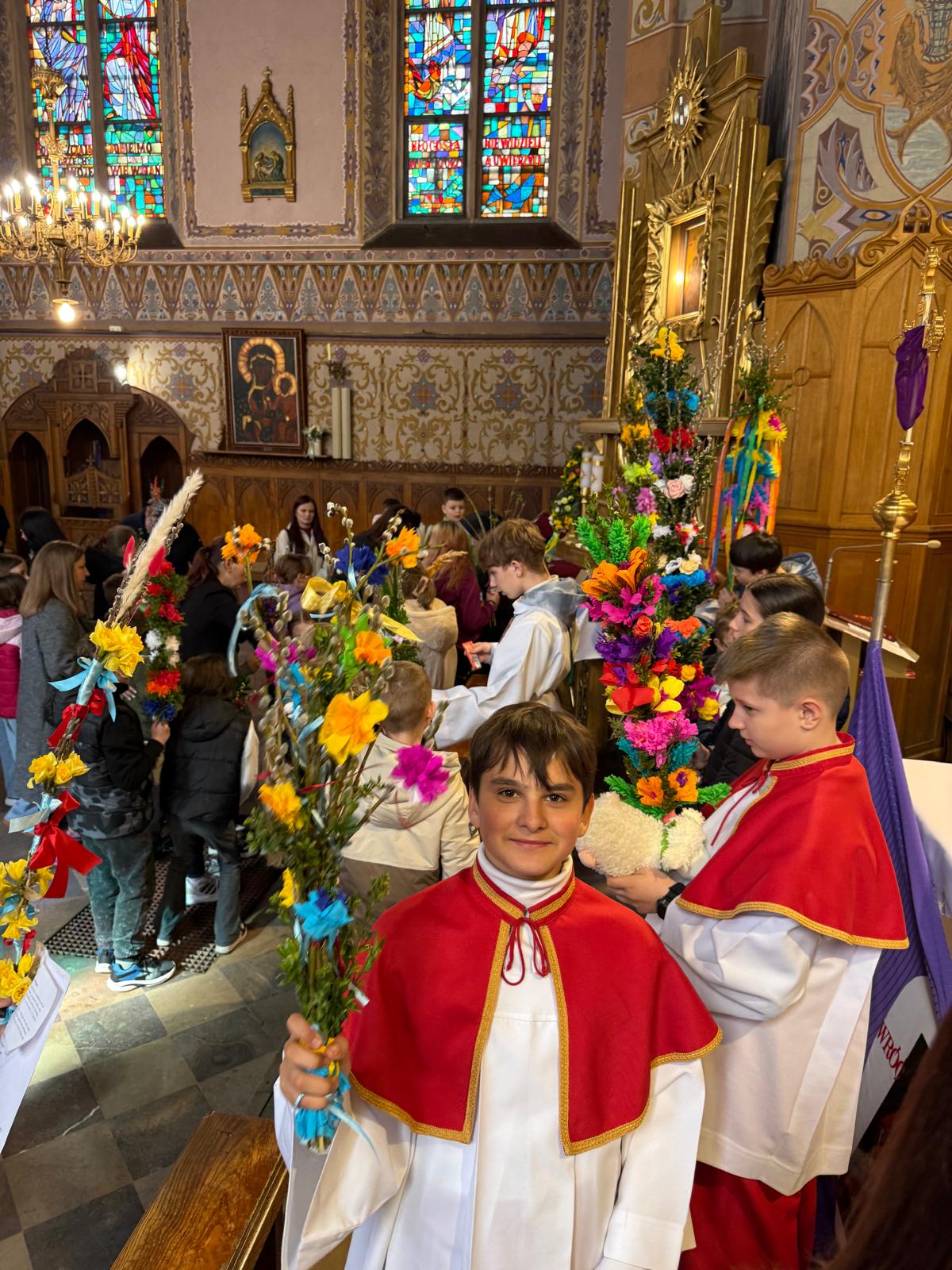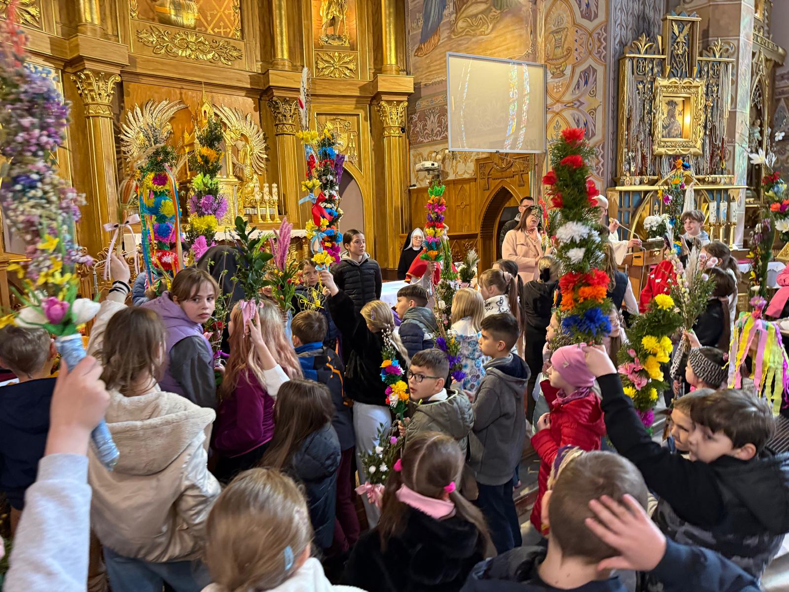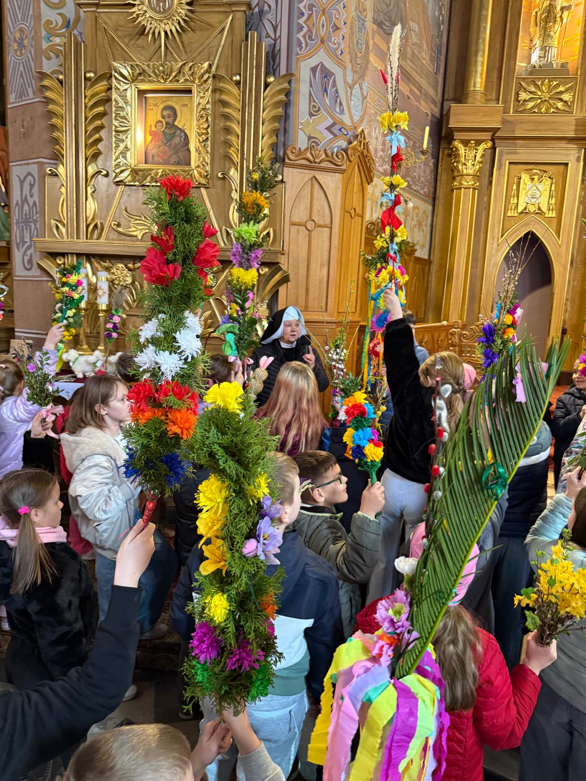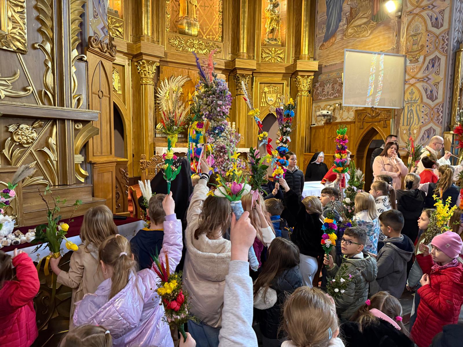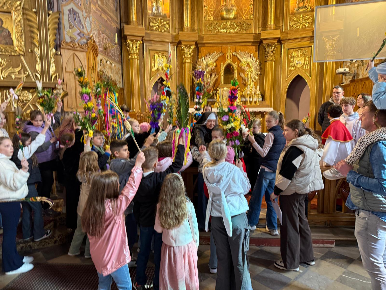 Wspomnienie uroczystego wjazdu Pana Jezusa do Jerozolimy znane jako niedziela palmowa co roku przeżywamy radośnie i kolorowo. Podczas Mszy Świętej o godzinie 11:30 odbyła się procesja wokół kościoła z palmami i wesołym śpiewem scholi dziecięcej prowadzonej przez p. Jolantę Wilczyńską. Cały kościół wypełniły własnoręcznie zrobione palmy i część wymagała nawet kilku tygodni pracy. Serdecznie gratulujemy! Zapraszamy do obejrzenia zdjęć z tego wydarzenia. Jednocześnie zachęcamy do uczestnictwa w Triduum Paschalnym w naszej Parafii.