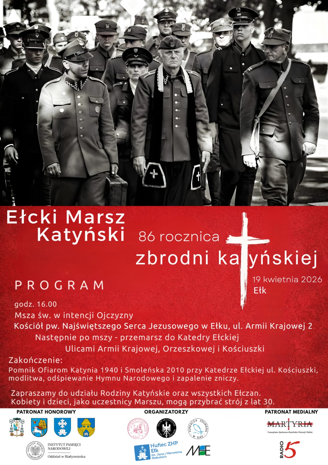 przypominając dramatyczne losy tych, którzy oddali życie za Ojczyznę. Uroczystości rozpoczną się w niedzielę 19 kwietnia o godz. 16.00 Mszą Świętą za Ojczyznę w kościele Najświętszego Serca Pana Jezusa. Eucharystii będzie przewodniczył bp Dariusz Zalewski. W sposób szczególny modlitwą obejmiemy ofiary Zbrodni Katyńskiej.Po Mszy Świętej wyruszy Marsz, który przejdzie ulicami: Armii Krajowej, Orzeszkowej oraz Kościuszki, by dotrzeć do Pomnika Ofiar Katynia i Smoleńska przy Katedrze Ełckiej. Tam nastąpi zakończenie uroczystości – zostanie przedstawiona symboliczna scena śmierci oficerów Wojska Polskiego, wspólnie odśpiewany Hymn Narodowy oraz odczytany krótki rys historyczny Zbrodni Katyńskiej. W tym roku uczestnicy złożą znicze jako znak pamięci i jedności. W trakcie Marszu przewidziane są dwa postoje – przy pomniku Michała Kajki oraz w połowie ulicy Orzeszkowej. W tych miejscach odczytywane będą fragmenty listów pomordowanych, pamiętniki oraz wspomnienia ocalałych, które pozwolą jeszcze głębiej przeżyć tę wyjątkową lekcję historii. Serdecznie zapraszamy rodziny katyńskie, mieszkańców Ełku i okolic do wspólnego udziału. Zachęcamy również kobiety i dzieci do założenia strojów z lat trzydziestych, co podkreśli historyczny charakter wydarzenia. Niech z naszych serc popłynie modlitwa i wdzięczność za tych, którzy zginęli na Wschodzie dlatego, że byli Polakami i tak wiele dla Niej znaczyli. Patronat honorowy nad uroczystością objęli: bp Jerzy Mazur, Instytut Pamięci Narodowej (Oddział w Białymstoku), Prezydent Miasta Tomasz Andrukiewicz, Starosta Ełcki Marek Chojnowski oraz Wójt Gminy Ełk Tomasz Osewski. Organizatorami wydarzenia są: Parafia pw. Świętego Jana Pawła II w Ełku, Stowarzyszenie Grupa Wschód, Hufiec ZHP w Ełku, Fundacja „Zdumienie” oraz Muzeum Historyczne w Ełku. Patronat medialny objęły „Martyria” – pismo diecezjalne oraz Radio 5. Serdecznie zapraszamy do wspólnego świadectwa pamięci. ks. dr. hm. Tadeusz Białous.